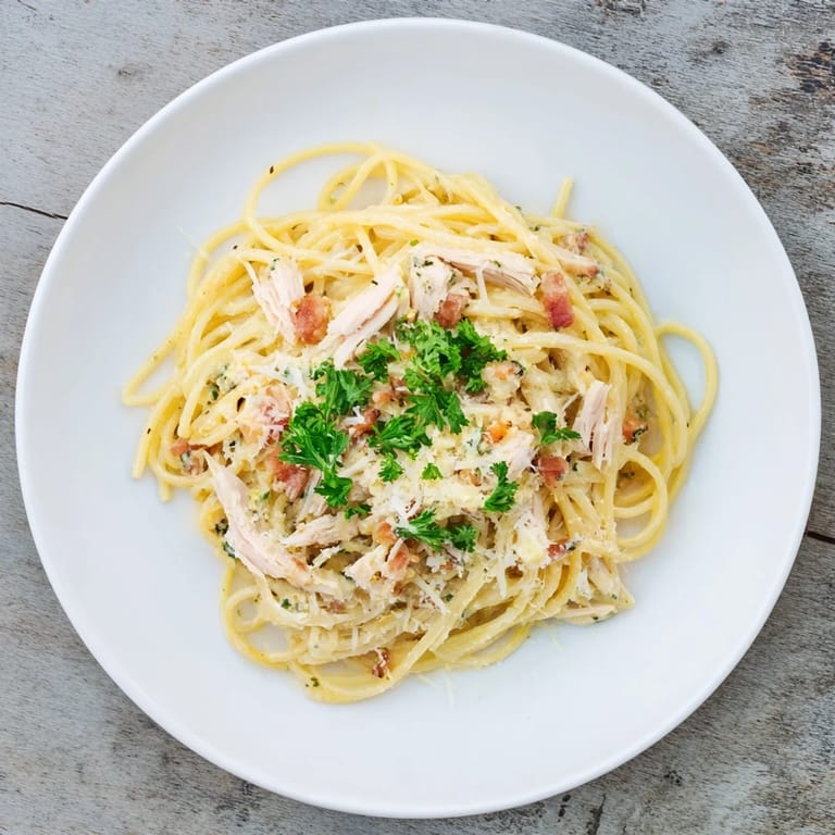 This recipe is forgiving and loves a little improvisation. Swap the chicken for cooked shrimp, or leave out the meat entirely and add sautéed mushrooms and peas for a vegetarian twist. Try using bucatini instead of spaghetti for a fun textural change, or toss in some red pepper flakes with the garlic if you like a little heat. I've even made it with leftover turkey after Thanksgiving, and it disappeared faster than the original holiday meal.