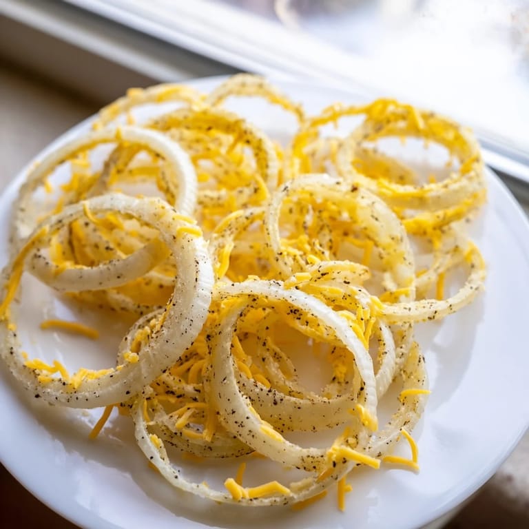 - Arrange dried onion rings in a single layer on a parchment-lined basket, then generously sprinkle your cheese mixture (cheddar, mozzarella, garlic powder, paprika, pepper, and salt mixed together) over each ring. Be generous here—thin coverage will disappear into melting, thick coverage creates the texture magic.