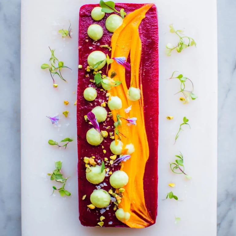 The genius of this dish is that the colors do half the work for you—the deep burgundy of beet, the warm golden-orange of carrot, and the pale creamy green of avocado create automatic contrast without you having to think too hard about it. But the real magic happens when you add those pistachios and microgreens, which pick up colors from each purée and tie them into a visual harmony. Your eye travels along the stripe naturally, noticing how each element makes the others look better.