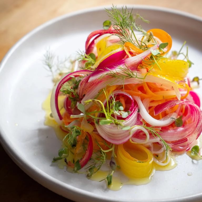 Save I discovered this salad by accident while experimenting with a mandoline one lazy afternoon, shaving vegetables thin enough to see light through them. What started as idle kitchen play—ribbons of golden beet, rainbow carrot, fennel curling under cold water—turned into something that looked almost too pretty to eat. My dinner guests that night kept circling the plate, unsure whether to dig in or take a photo first. That moment taught me that sometimes the most memorable dishes aren't the ones with the longest ingredient lists, but the ones that make people pause and really look.