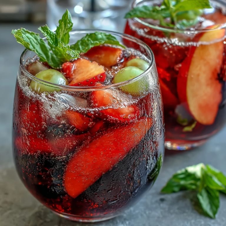 Serve this Spring Sangria Mocktail in large wine glasses or tumblers filled with ice, making sure each glass gets a generous portion of the soaked fruit—it's not just for show, the fruit is delicious to eat after it's absorbed all those flavors. For a festive presentation, rim the glasses with sugar or use decorative citrus wheels on the rim. This mocktail pairs beautifully with Mediterranean-inspired dishes like tapas, grilled vegetables, fresh salads, or light seafood. It's also an excellent companion to brunch spreads featuring quiches, fruit platters, and pastries. For outdoor gatherings, serve it in a large glass dispenser with a ladle so guests can help themselves, and keep extra sparkling water nearby for those who prefer a lighter, more diluted version.