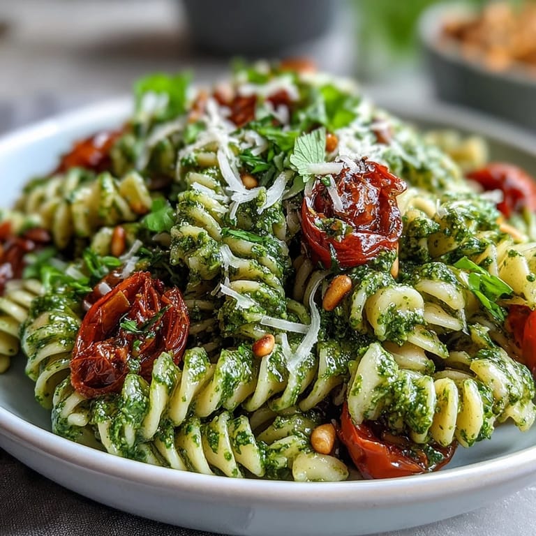 Save This pasta salad brings together the aromatic flavors of Italy with the simplicity of fresh, seasonal ingredients. The homemade pesto adds a rich and creamy texture while maintaining a bright, herbal note, perfectly balancing the tangy cherry tomatoes and sharp parmesan. Whether served immediately or chilled, it holds its appeal throughout the day.