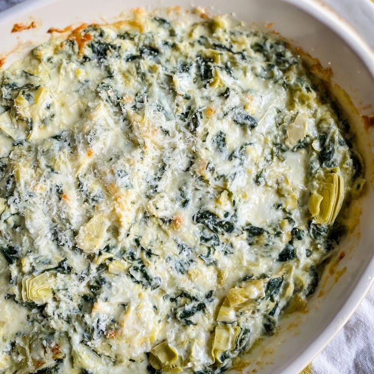 Save A creamy, cheesy dip loaded with tender spinach and artichoke hearts, perfect for serving warm with bread or crackers as a comforting appetizer.